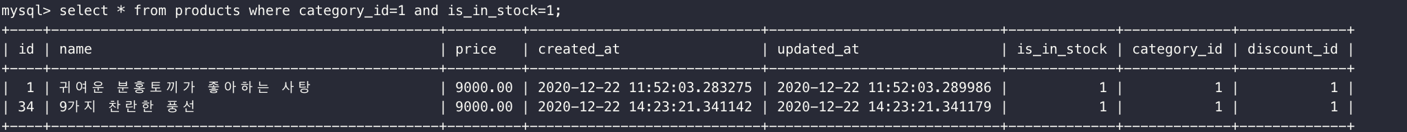 select * from products where category_id=1 and is_in_stock=1;