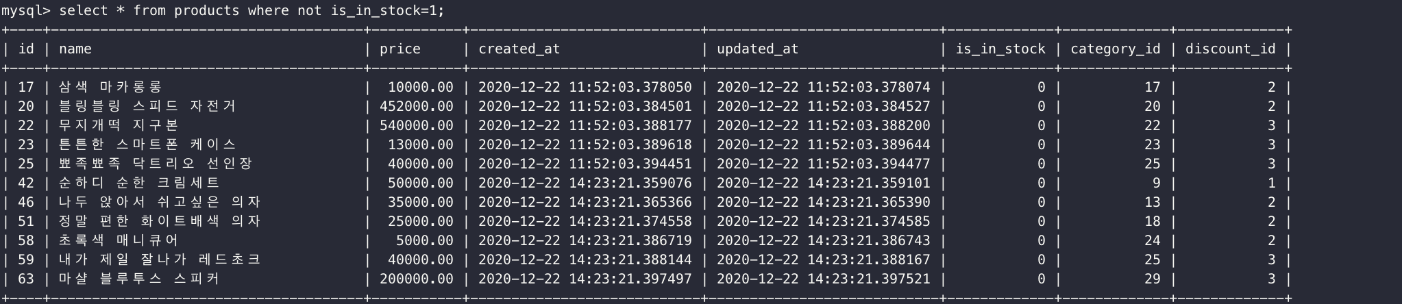 select * from products where not is_in_stock=1;