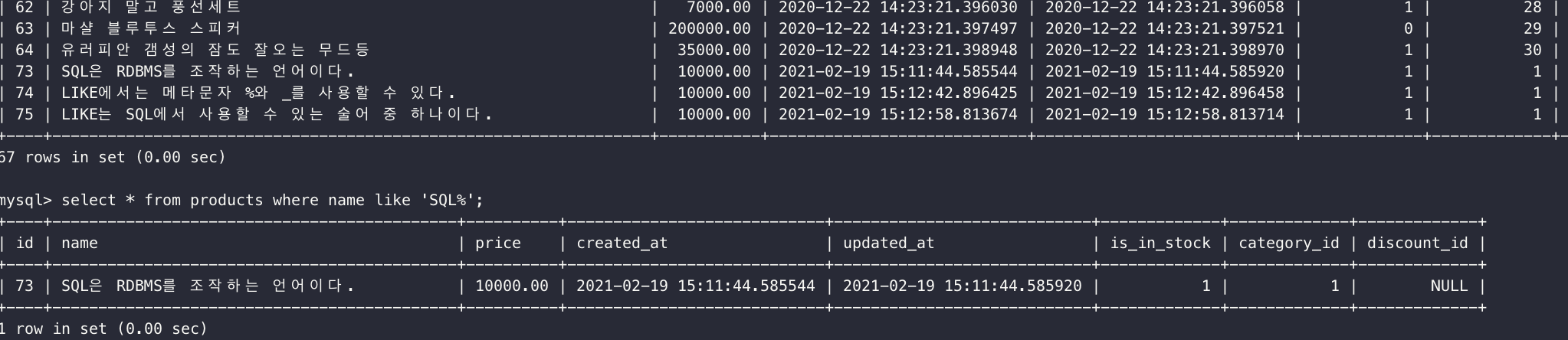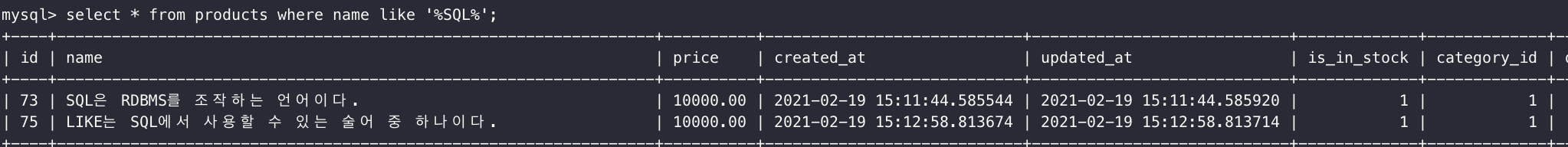 select * from products where name like '%SQL%';