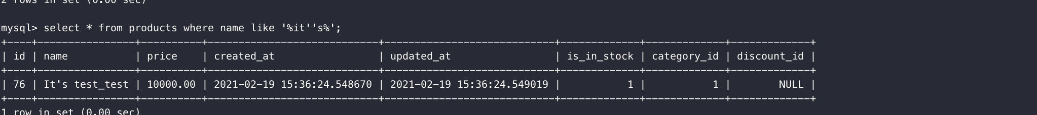 select * from products where name like '%it''s%';