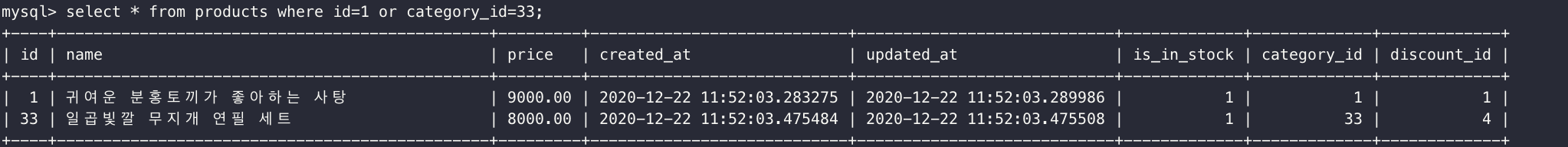 select * from products where id=1 or category_id=33;