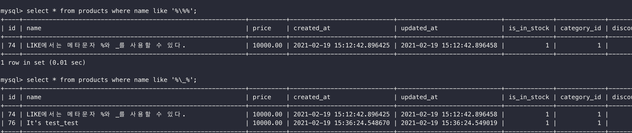 '\%'와 같이 \을 %앞에 붙이면 된다.select * from products where name like '%%%'; => X select * from products where name like '%\%%';첫번째 코드의 경우 문자열이 포함된 모든 값이 검색되므로 두번째 코드가 올바르다.