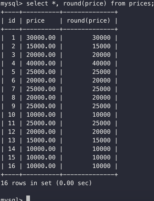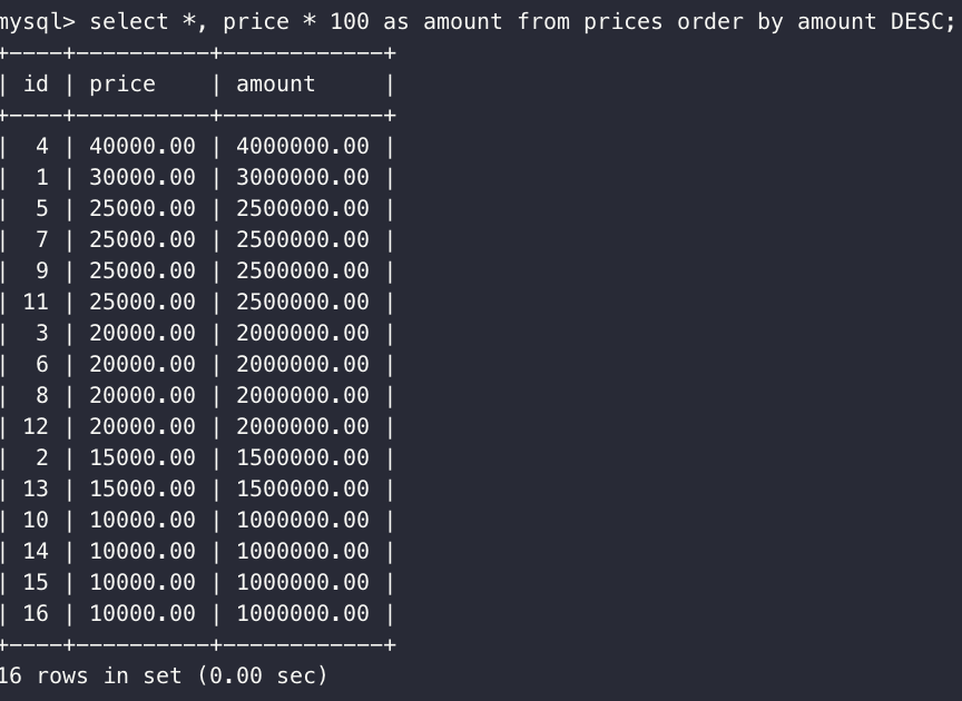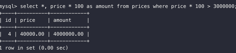 select *, price * 100 as amount from prices where price * 100 > 3000000;