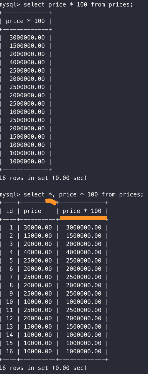 SELECT price * 100 FROM prices; SELECT *, price * 100 FROM prices; 전체 열 추가 지정