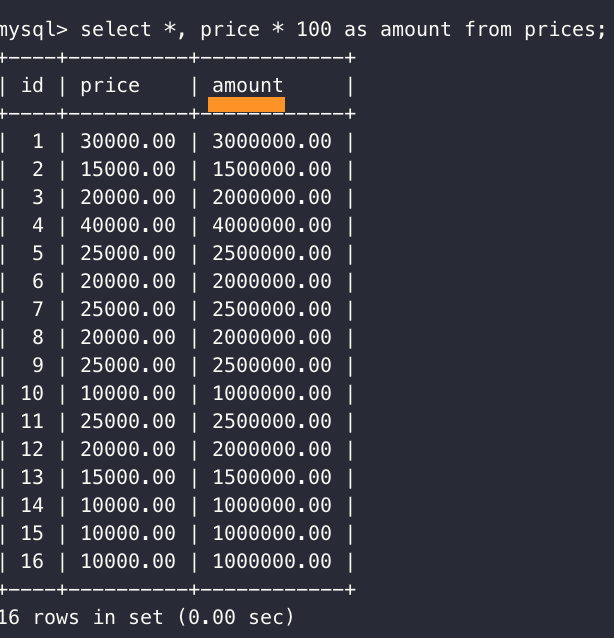 SELECT *, price * 100 AS amount FROM pirces; SELECT *, price * 100 amount FROM pirces; # AS 생략가능