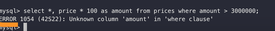 따라서, WHERE 입장에서는 amount라는 열을 찾을 수 없는 상태이므로 에러가 발생하게 되는것이다.