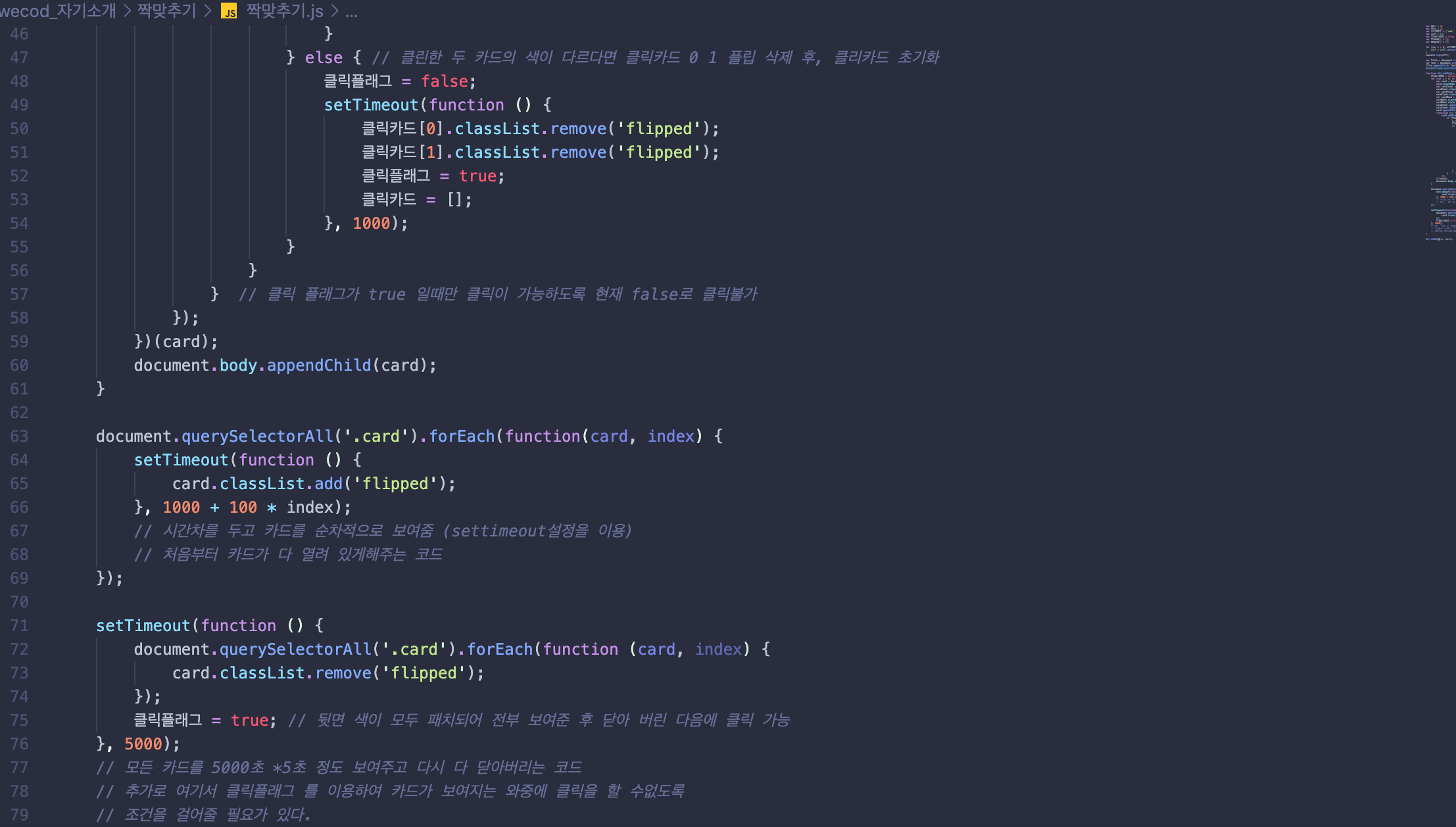 클릭플래그 = true; // 뒷면 색이 모두 패치되어 전부 보여준 후 닫아 버린 다음에 클릭 가능