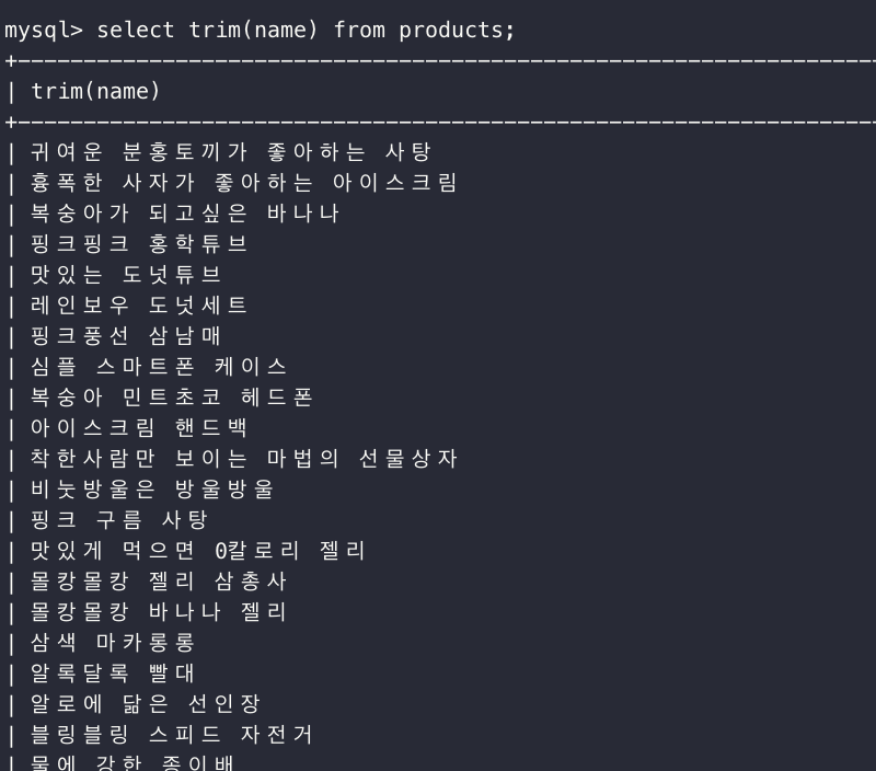 TRIM('ABC ') => 'ABC'SELECT TRIM(name) FROM products;