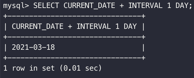SELECT CURRENT_DATE + INTERVAL 1 DAY;