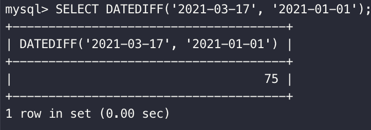 SELECT DATEDIFF('2021-03-17', '2021-01-01');