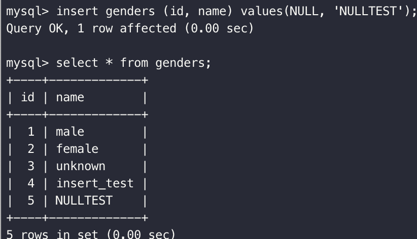 INSERT INTO (id, name) VALUES (NULL, "NULLTEST");필드 id의 경우 NULL값이 어떻게 적용될 수 있었을까?