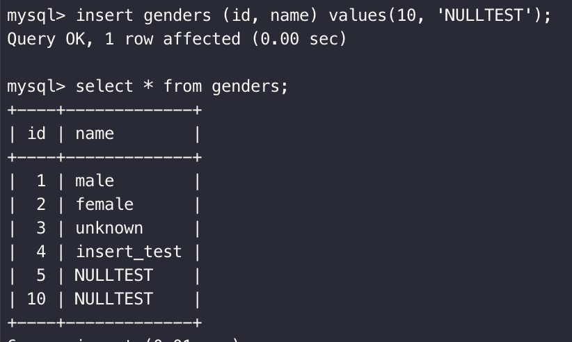 INSERT genders (id, name) VALUES(10, 'NULLTEST');