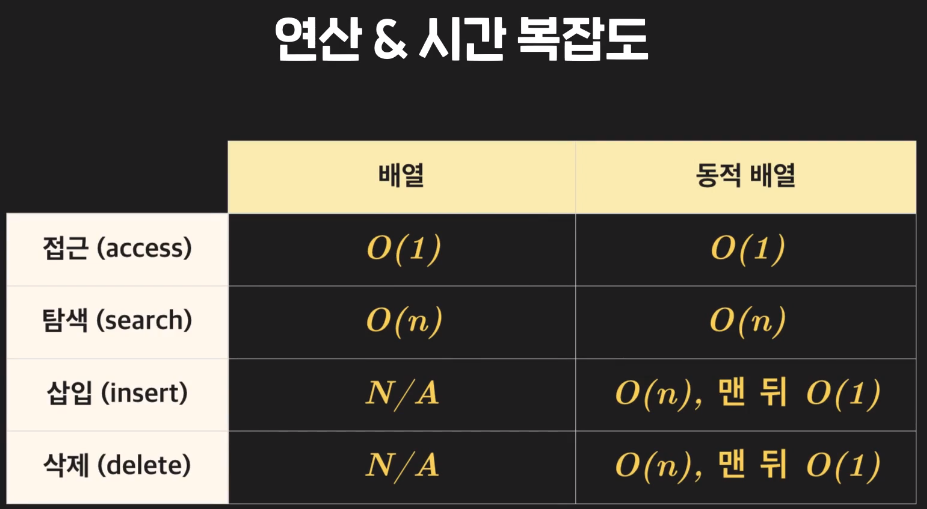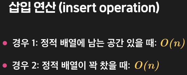 배열에 남아 있는 공간 없다면 크기를 늘린 배열에 이전 배열을 복사해야하 기에 O(n)