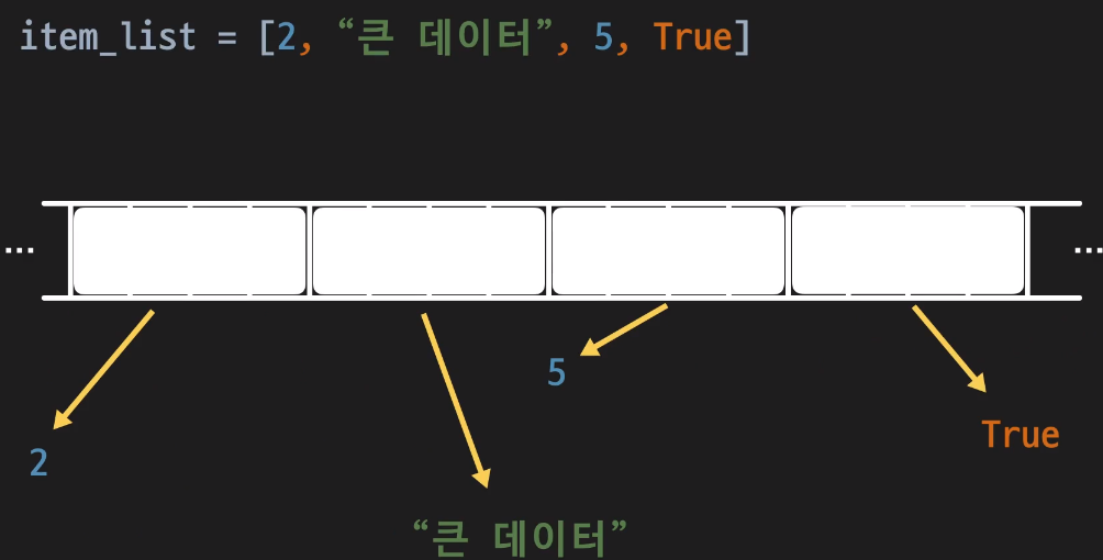 따라서, 2 , 3, 5, 7을 담고있는게아닌 가르키고있다는 표현이 맞으며 레퍼런스를 저장하기 때문에 파이썬의 리스트에서는 형식에 상관없이 다양한 타입의 값들을 저장할 수 있는 것이다.