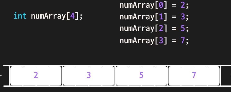 보통 C의 배열에서는 정수하나가 4 Byte를 차지하기 때문에 아래와 같이 크기가 4인 배열은