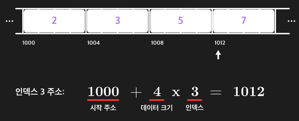 순서대로 연속적으로 저장하기 때문에 시작되는 주소를 참고하여 배열의 인덱스에 빠르게 접근할 수 있다.