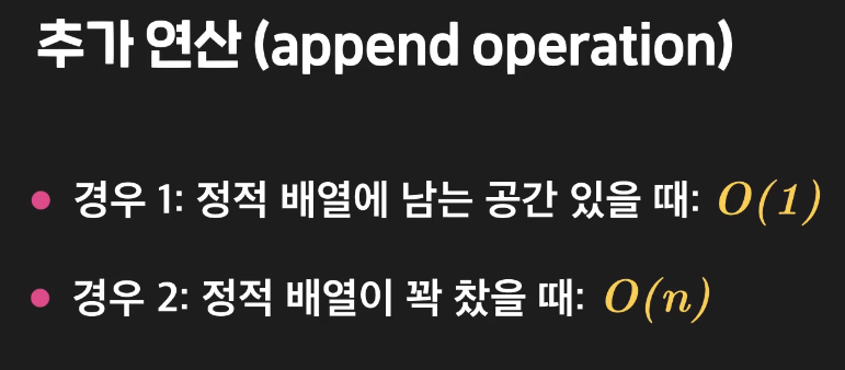 정적 배열을 기반으로 하는 동적 배열의 추가 연산의 경우
