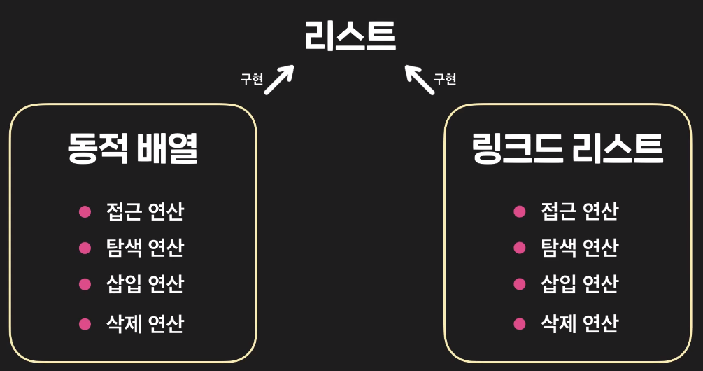 즉, 리스트 라는 추상 자료형을 동적 배열이 또는 링크드 리스트라는 자료구조로 구현을 할 수 있다고 말한다.