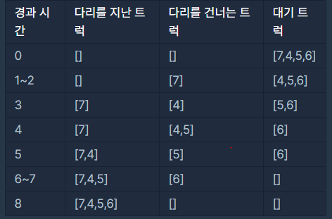 다리의 길이만큼 0을 큐에 추가해주고 이 큐(다리를 건너는 트럭)를 이용해야 한다는 점이다.