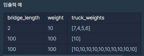 solution 함수의 매개변수로 다리 길이 bridge_length, 다리가 견딜 수 있는 무게 weight, 트럭 별 무게 truck_weights가 주어집니다. 이때 모든 트럭이 다리를 건너려면 최소 몇 초가 걸리는지 return 하도록 solution 함수를 완성하세요.