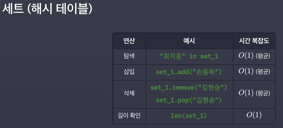따라서 세트를 사용한 연산에서도 O(1)으로 효율적으로 사용할 수 있다.