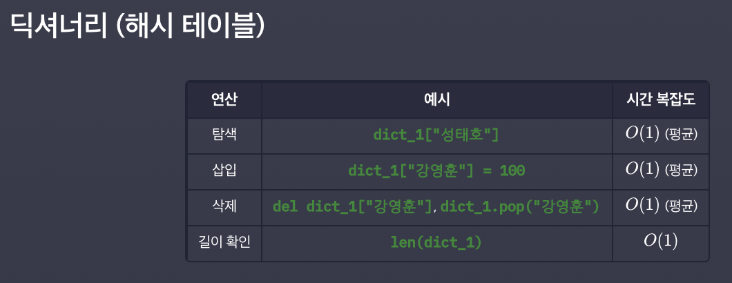 딕셔너리에서는 탐색/ 삽입 / 삭제 연산은 O(1)의 시간 복잡도를 갖는다.