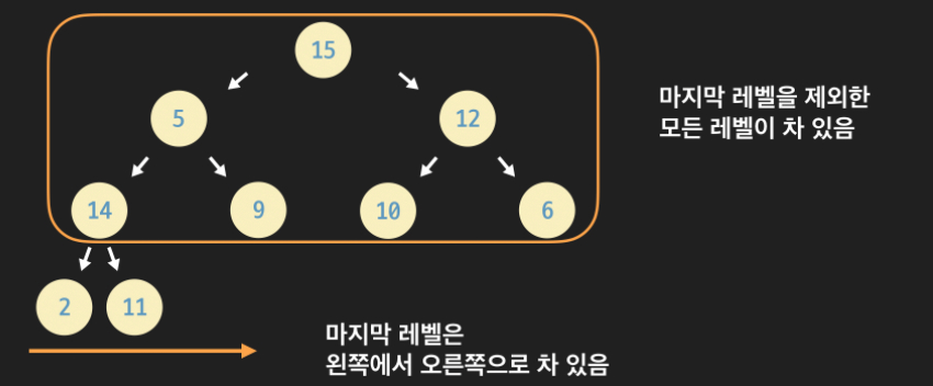 이때, 조건 마지막 레벨에서는 노드가 다 채워질 필요가 없지만 왼쪽부터 오른쪽 방향으로 노드들이 채워져야 함.