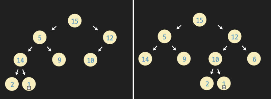 - - 마지막 레벨은 왼쪽에서 오른쪽 방향으로 노드들로 가득 차 있어야 함(오른쪽은 비어있어도 되지만 왼쪽은 비어있으면 안 됨)