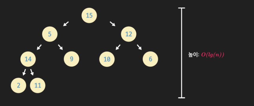 완전 이진 트리 안에 저장된 노드의 개수를 N이라 하면 높이는 항상 lg(N)에 비례한다.