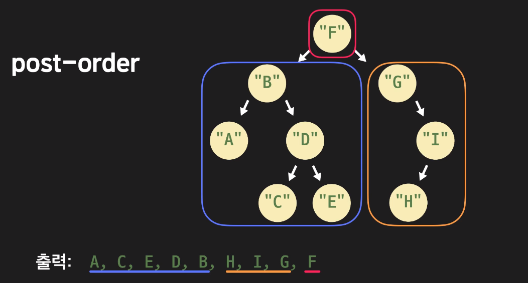 부분 트리 순회를 한 후에 현재 노드를 출력하는 순회 방식이다.