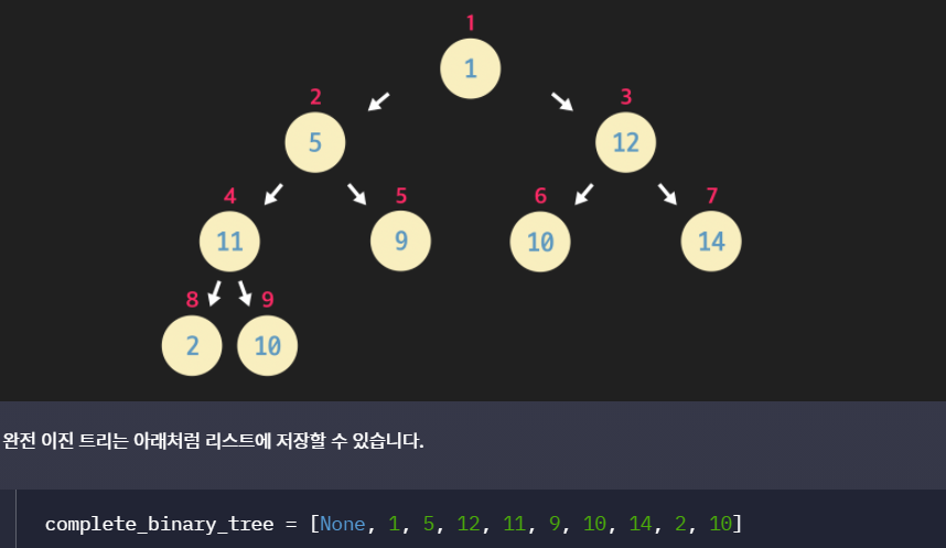 완전 이진 트리의 2가지 특성을 이용해 파이썬 리스트로 구현을 할 수 있다.