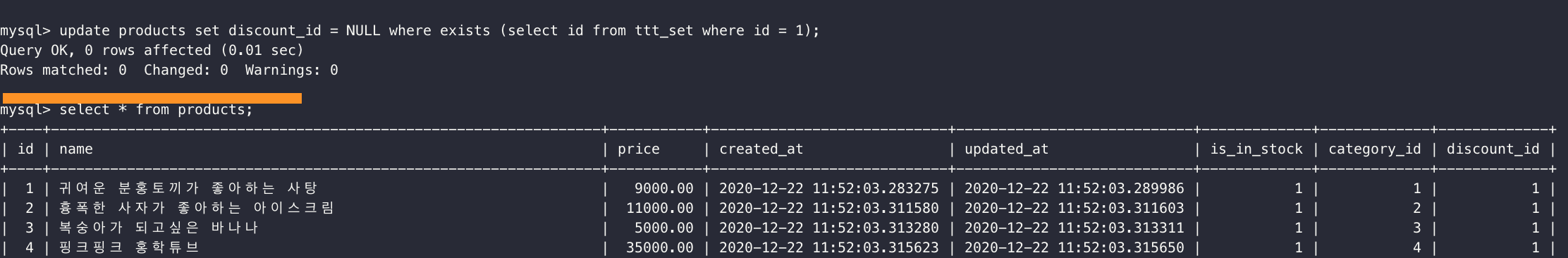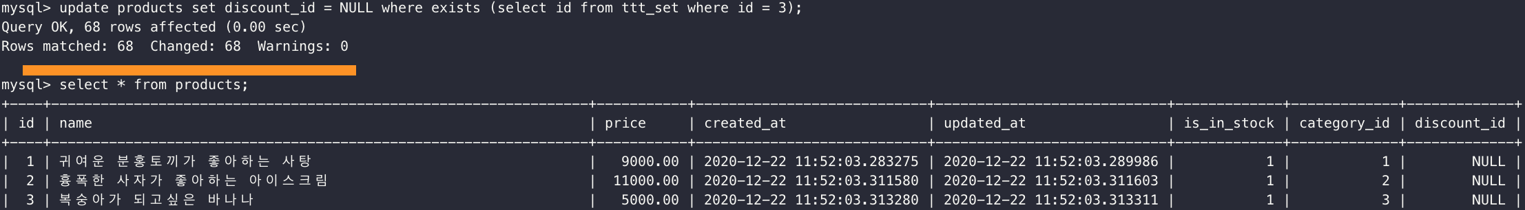 현재 ttt_set 테이블의 id = 3인 값 존재한다. 따라서 discount_id를 NULL로 갱신된 것을 확인할 수 있다.