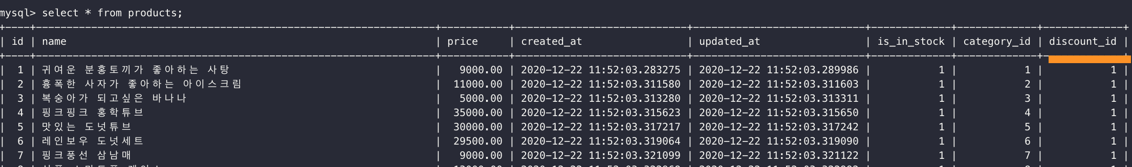 products의 discount_id 열 => 현재 모든 셀의 값은 1 인 상태이다.