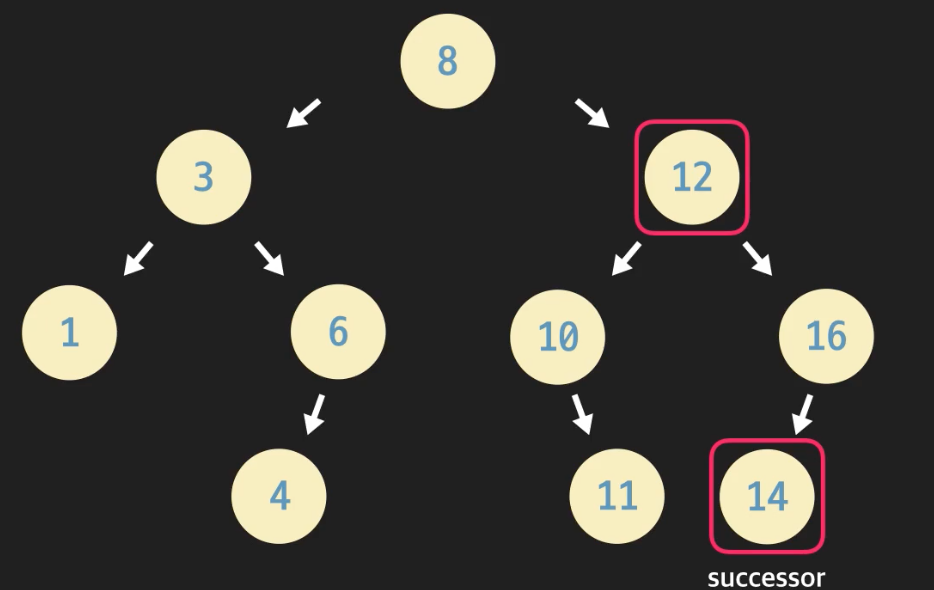위의 예시에서 successor는 14가 되고 successor는 12보다 항상 크며, SUCCESSOR는 왼쪽 자식 노드를 가질 수 없다.