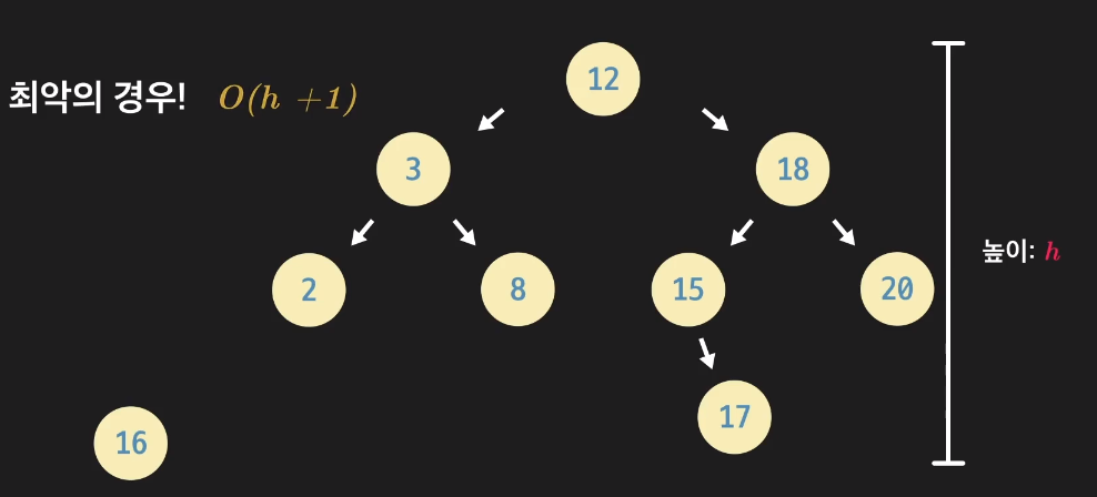루트 노드 부터 비교 해야 하며, 트리의 높이는 0에서 시작하므로 16이 삽입될 자리는 찾는데 12, 18, 15, 17 총 4번의 비교를 해야하고 이는 H + 1과 같다