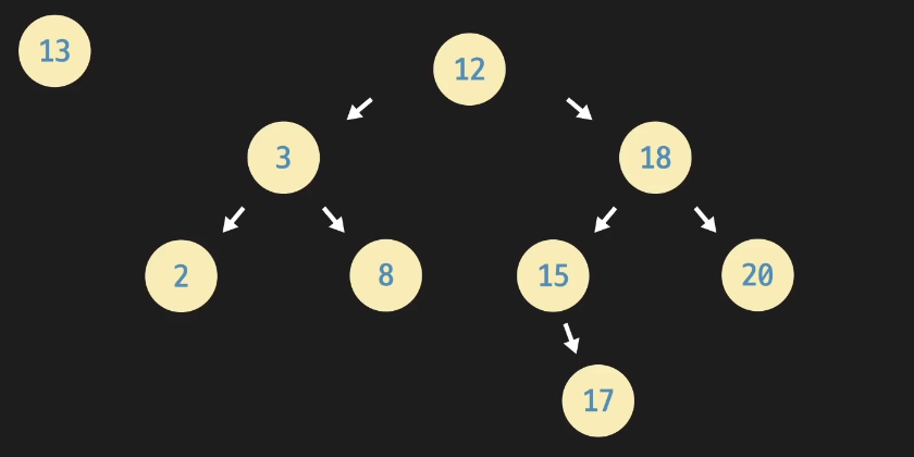 13을 삽입할때는 12, 18, 15 순으로 비교하며 15의 왼쪽 노드에 위치해야함을 찾을 수 있다.