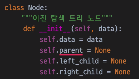 따라서, 배열 또는 파이썬 리스트를 이용해 구현하지 않고 노드 클래스와 인스턴스를 생성하여 연결시키는 방법으로 구현하며 노드가 왼쪽/오른쪽 자식 노드에 대한 레퍼런스에 추가로 부모에 대한 레퍼런스를 갖는 방식으로 구현한다. (링크드 리스트를 구현하는 방법과 유사하다.)