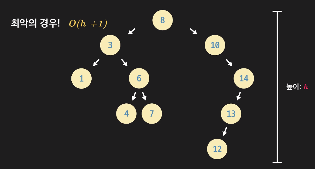 최악의 경우는 트리의 가장 깊이 있는 노드의 데이터를 탐색할때이다.