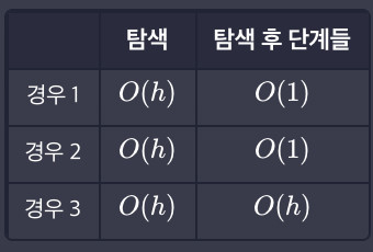 삭제 연산의 시간복잡도는 공통적으로 삭제하고자 하는 노드를 탐색하는 과정이 선행된다. O(H)