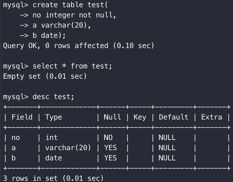 정의하는 열의 자료형 (정수, 실수, 문자열...) NULL 허용 여부등 정의하고자 하는 테이블의 명을 명시하여 테이블을 생성 할 수 있다.
