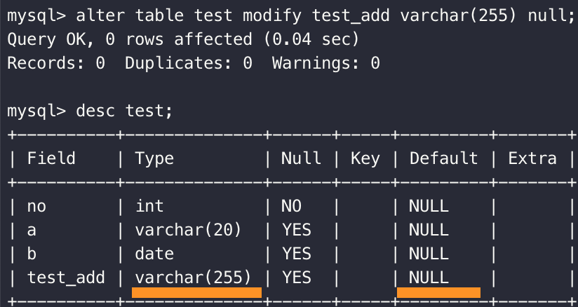 MODIFY + 열 이름 변경 = CHANGE.