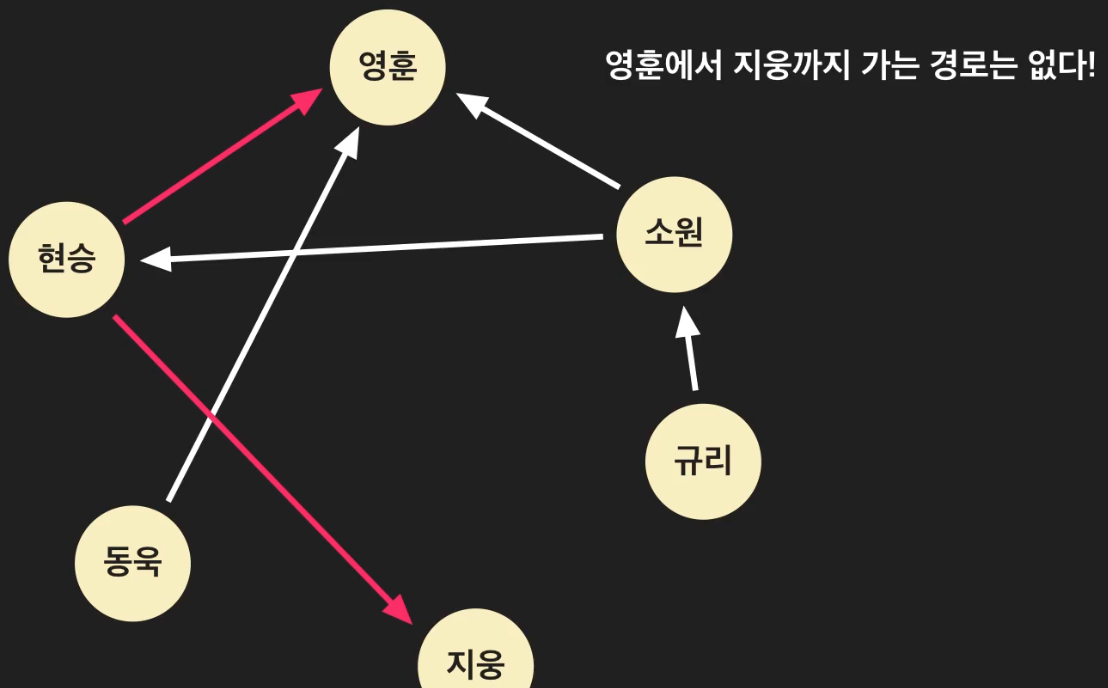 에지들의 방향 때문에 영훈에서 지웅까지 가는 경로가 없다!