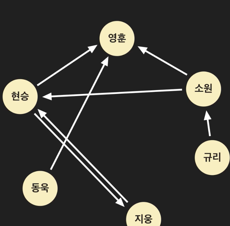 인스타그램 팔로우를 예시로 아래와 같은 방향 그래프를 나타낼 수 있다.