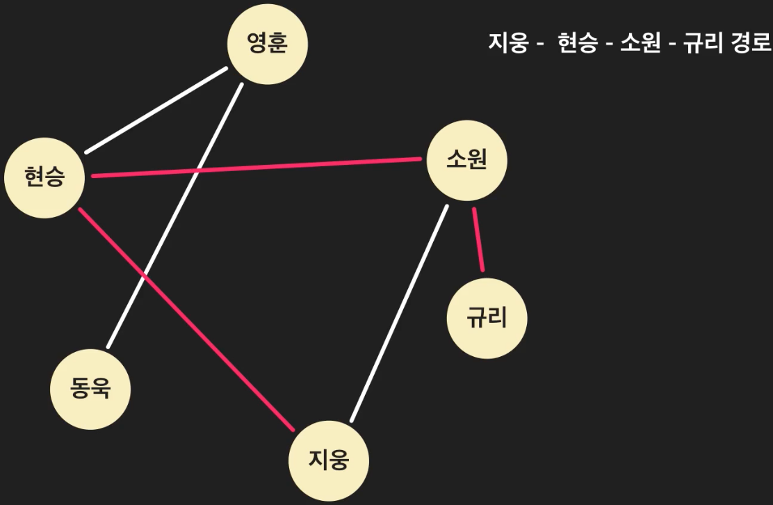지웅과 규리 사이에는 경로가 하나 더 존재하는데, 실제로 각 노드 사이에는 무수히 많은 경로가 존재하거나 아예 없을 수 있다.
