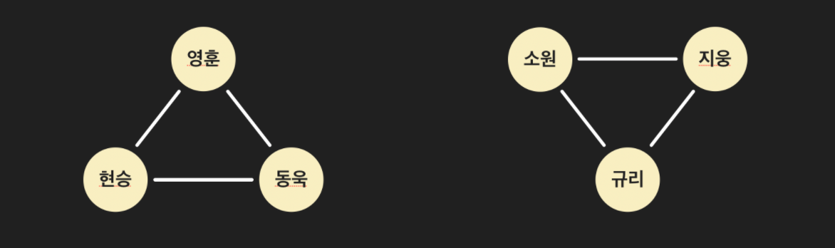 세상 모든 사람들이 친구 관계가 아니듯 아래와 같이 보기에는 나누어져 있는 그래프로 보일지 모르지만 실제로는 하나의 SNS 유저 그래프이며 극단적으로 아예 에지가 없이 노드로만 구성된 그래프도 존재할 수 있다!!