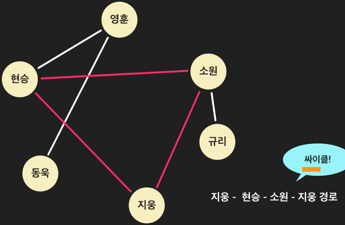 사이클 : 한 노드에서 시작해서 같은 노드로 돌아오는 경로