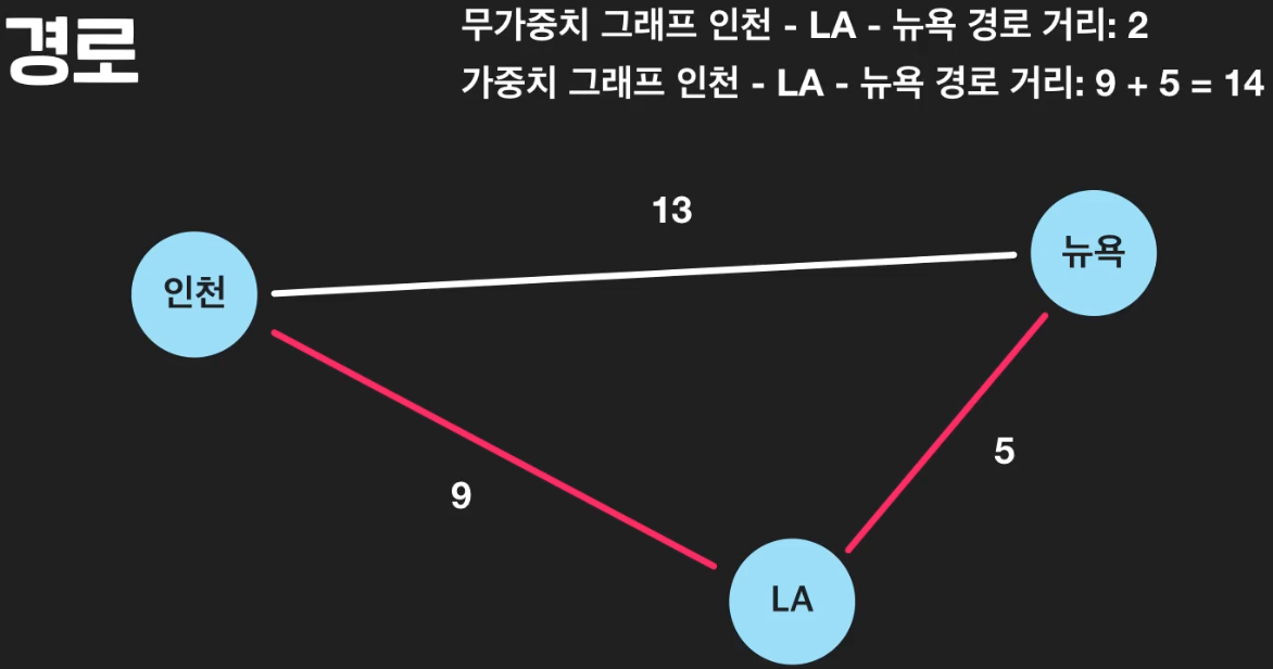 - 가중치 그래프 : 한 경로에 있는 엣지의 가중치의 합