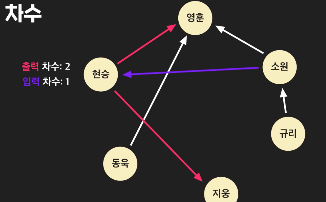 영훈은 에지를 2개 가지고 있으므로 영훈의 차수는 2이다.