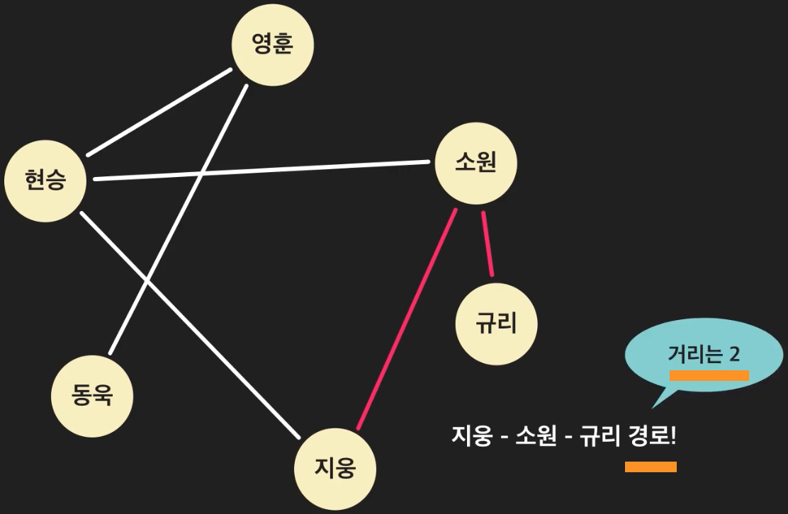 지웅과 규리는 지웅-현승-소원-규리 경로로 연결되어있으며, 이때의 경로의 거리는 4이다.