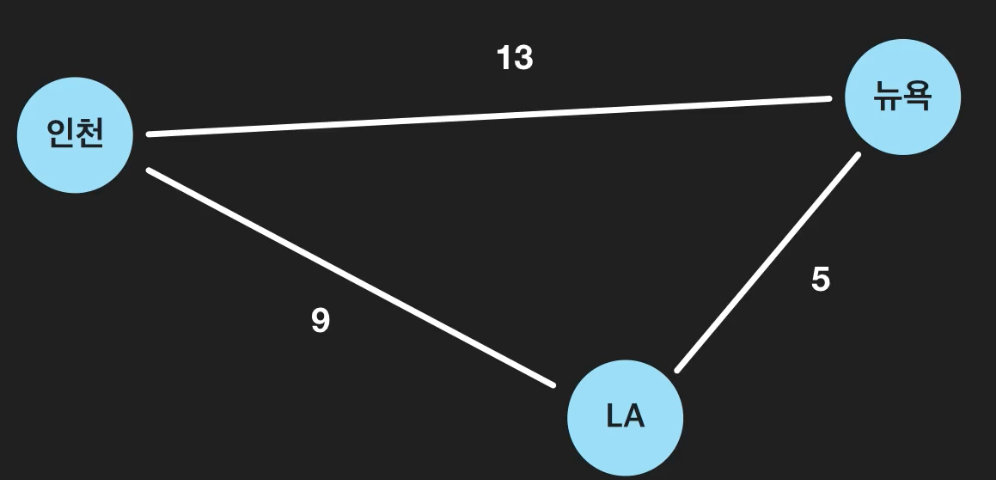 인천-LA-뉴욕의 경로가 거리는 2가 아니라 14이다.